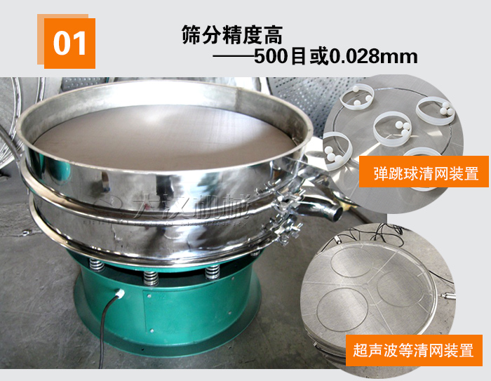旋振篩篩分物料范圍廣,500目或0.028mm的顆粒及粉狀物料均可以高效篩分,另外,我們廠家生產(chǎn)的旋振篩設備還設置有彈跳球、超聲波等清網(wǎng)裝置,針對有些精細粉狀物料,我們的旋振篩設備可以很好地降低粉狀物料因靜電,比重輕等因素造成的堵塞網(wǎng)孔的現(xiàn)象。