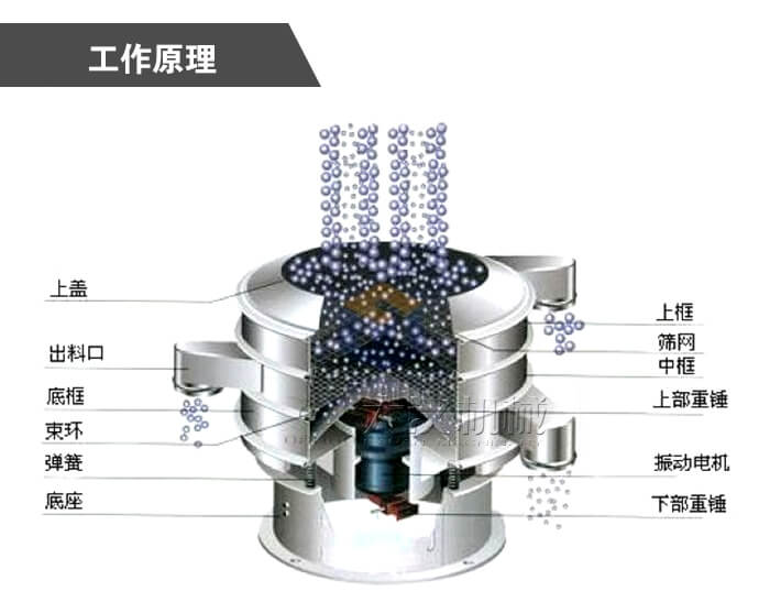 圓形旋振篩主要由進料口、防塵蓋、出料口、束環、篩網、配重塊、上部重錘、振動體、振動電機、彈簧、下部重錘、機座等部分組成。
