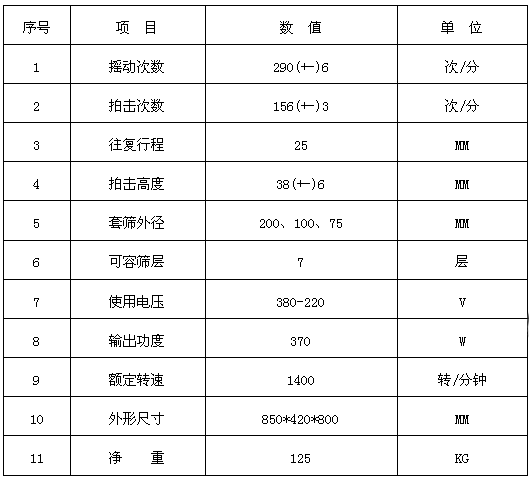 二、齒輪式拍擊篩技術參數:本機符合國際標準要求(見表一)