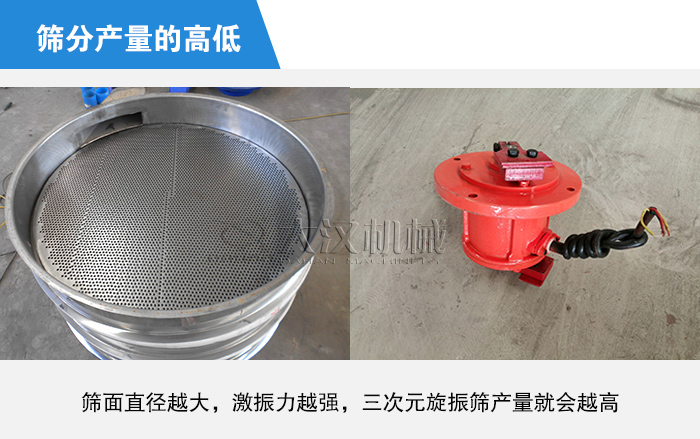 篩面直徑和電機激振力決定設備產量的高低,所以篩面直徑越大,激振力越強,三次元旋振篩產量就會越高,但是小編在這里需要提醒大家的是,電機激振力的調整需要在可承受范圍內進行調節,具體可以咨詢正規的振動篩廠家。